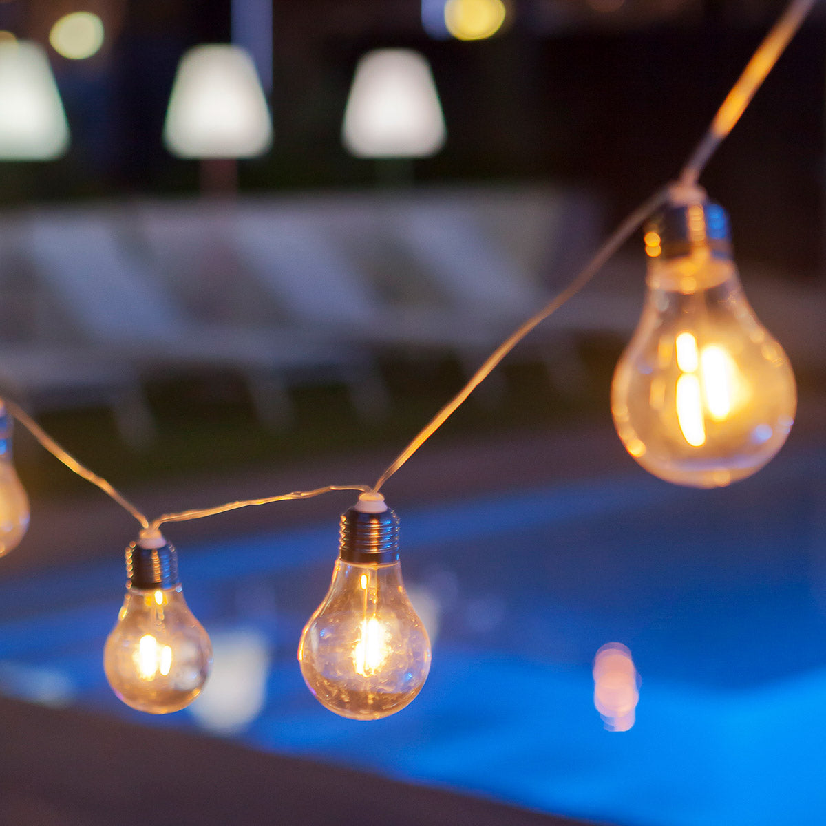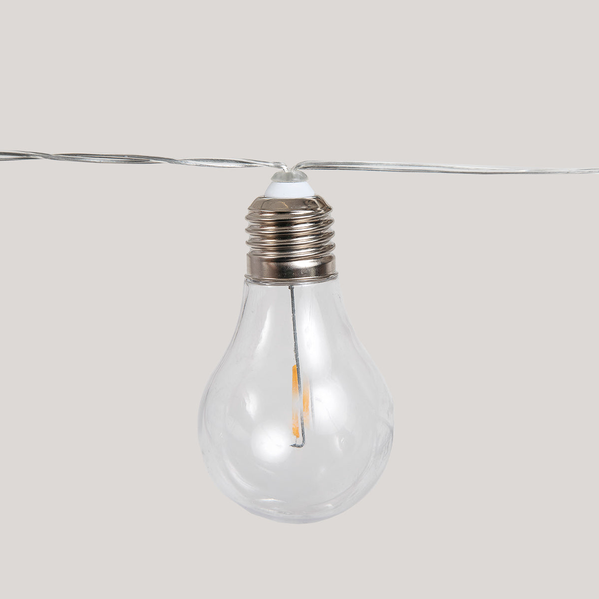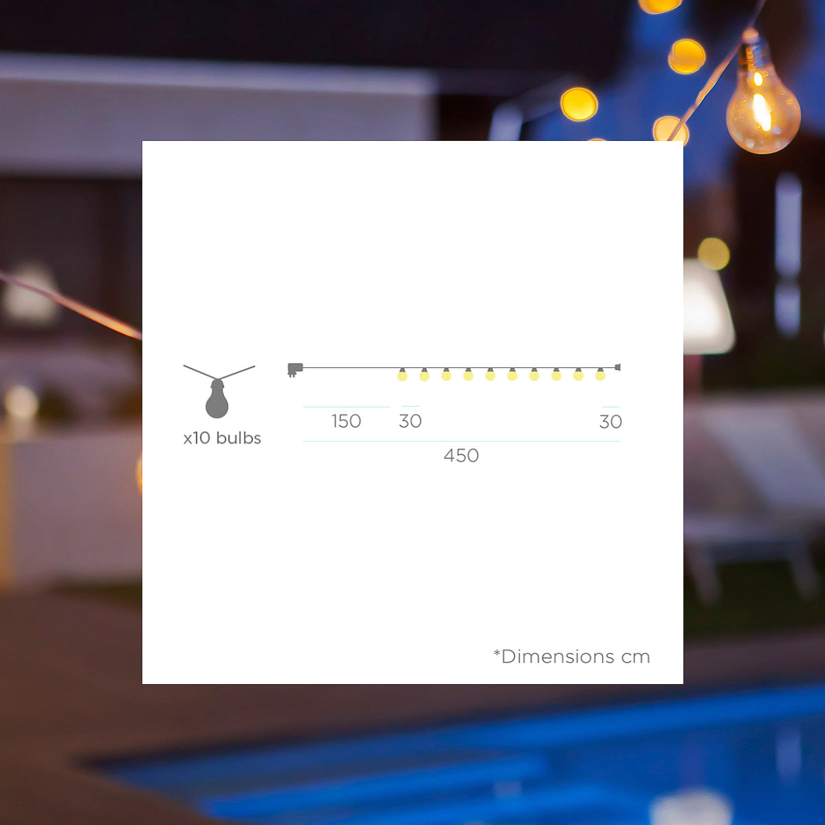 La dimensione della ghirlanda è di 4,5 metri con uso esterno ed interno IP44 e ha 10 lampadine.