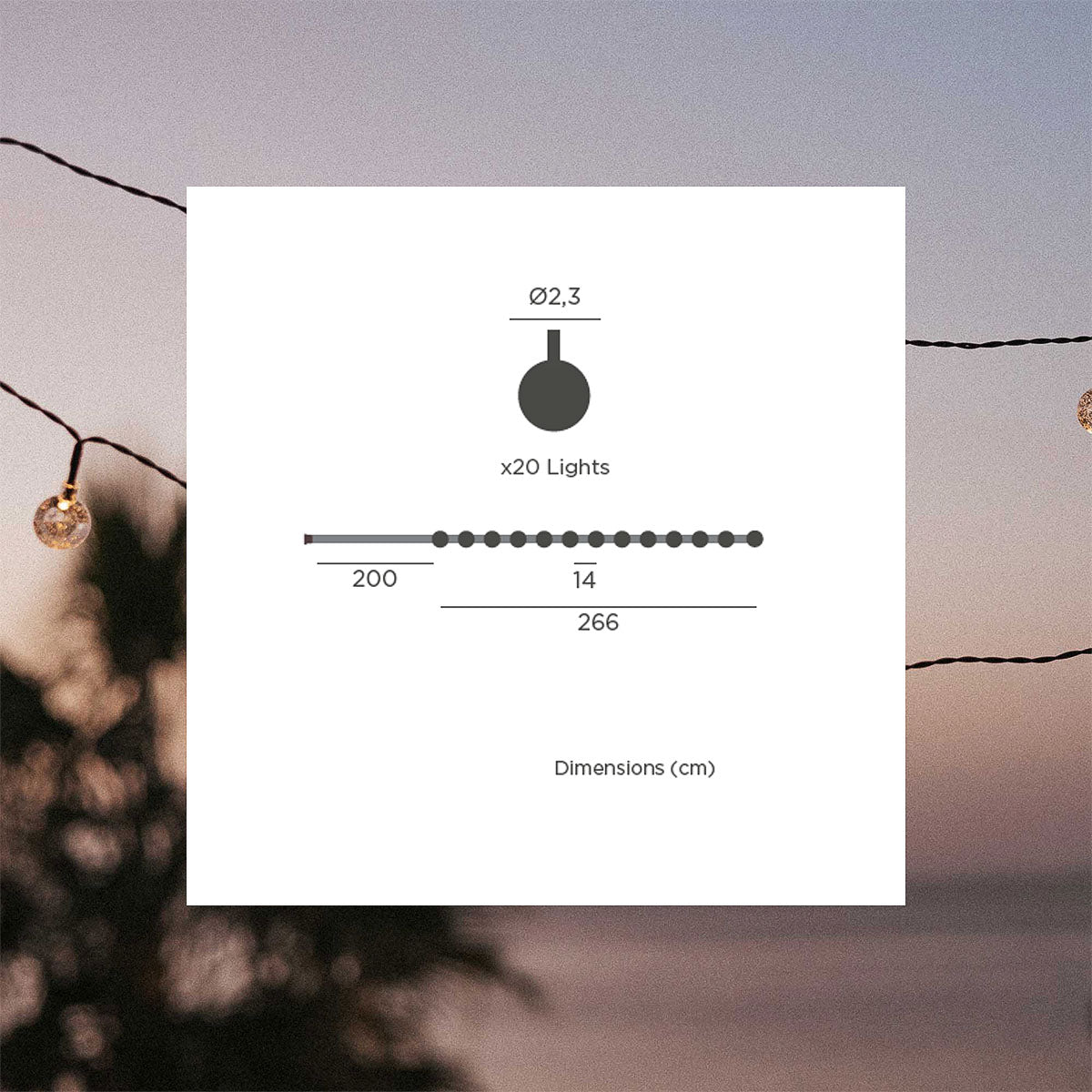 La ghirlanda solare Griselda Glossy non vi lascerà indifferenti. La ghirlanda è composta da una prolunga lunga 266 cm e da 20 lampadine a effetto cristallo che producono una luce decorativa molto particolare. Griselda Glossy diventerà un must della vostra casa, non solo a Natale, ma tutto l'anno. Senza installazione e adattabile a tutti i tipi di ambienti, potete utilizzarla ovunque nel vostro giardino, assicurandovi che il suo pannello solare riceva il massimo delle ore di luce in modo che il suo funzionamento sia il più ottimale possibile.