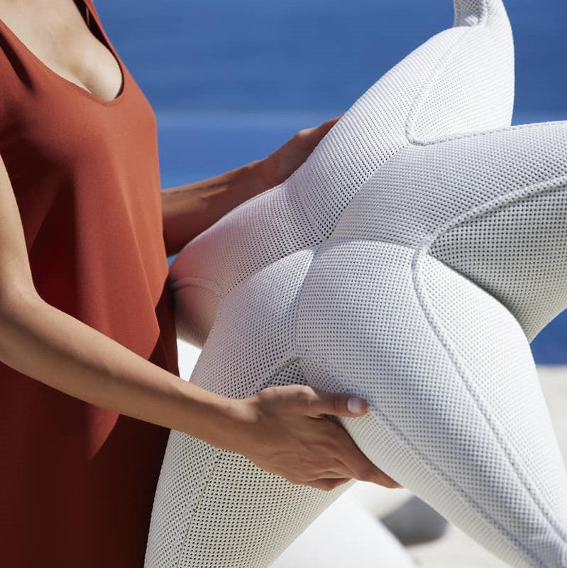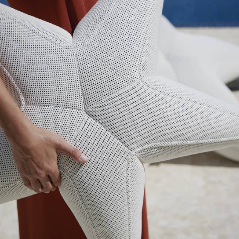 "AGORA 3D": tessuto tridimensionale, traspirante e drenante. Queste caratteristiche, unite all'imbottitura in polistirene espanso, consentono al prodotto di galleggiare.