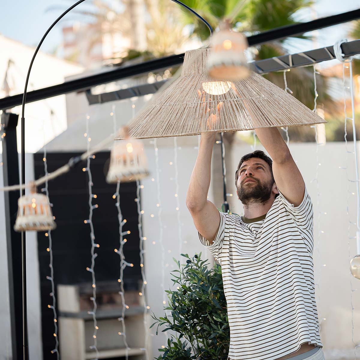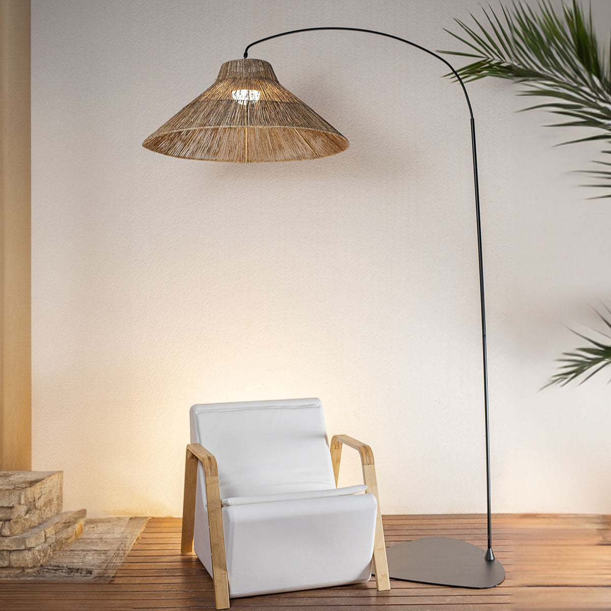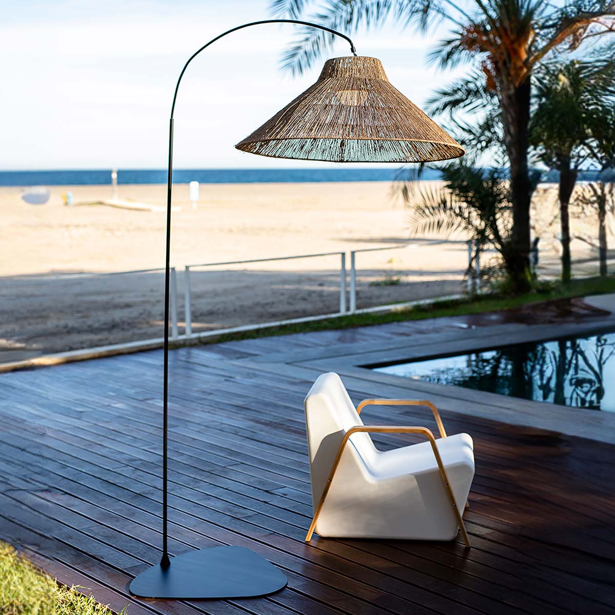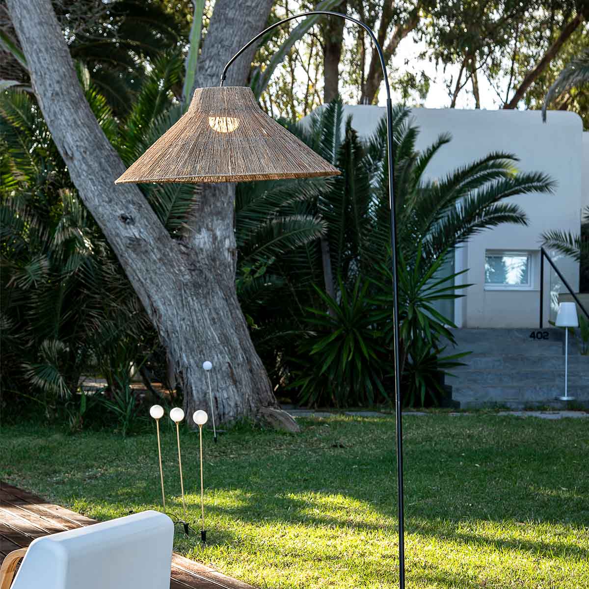 Niza è una lampada da terra che non ha bisogno di cavi. Il suo corpo in metallo laccato nero raggiunge un'altezza massima di 230 cm rendendola la lampada da terra ad arco ideale per qualsiasi spazio in giardino. Il suo paralume è intrecciato a mano con fibre naturali e ha un diametro di 80 cm.