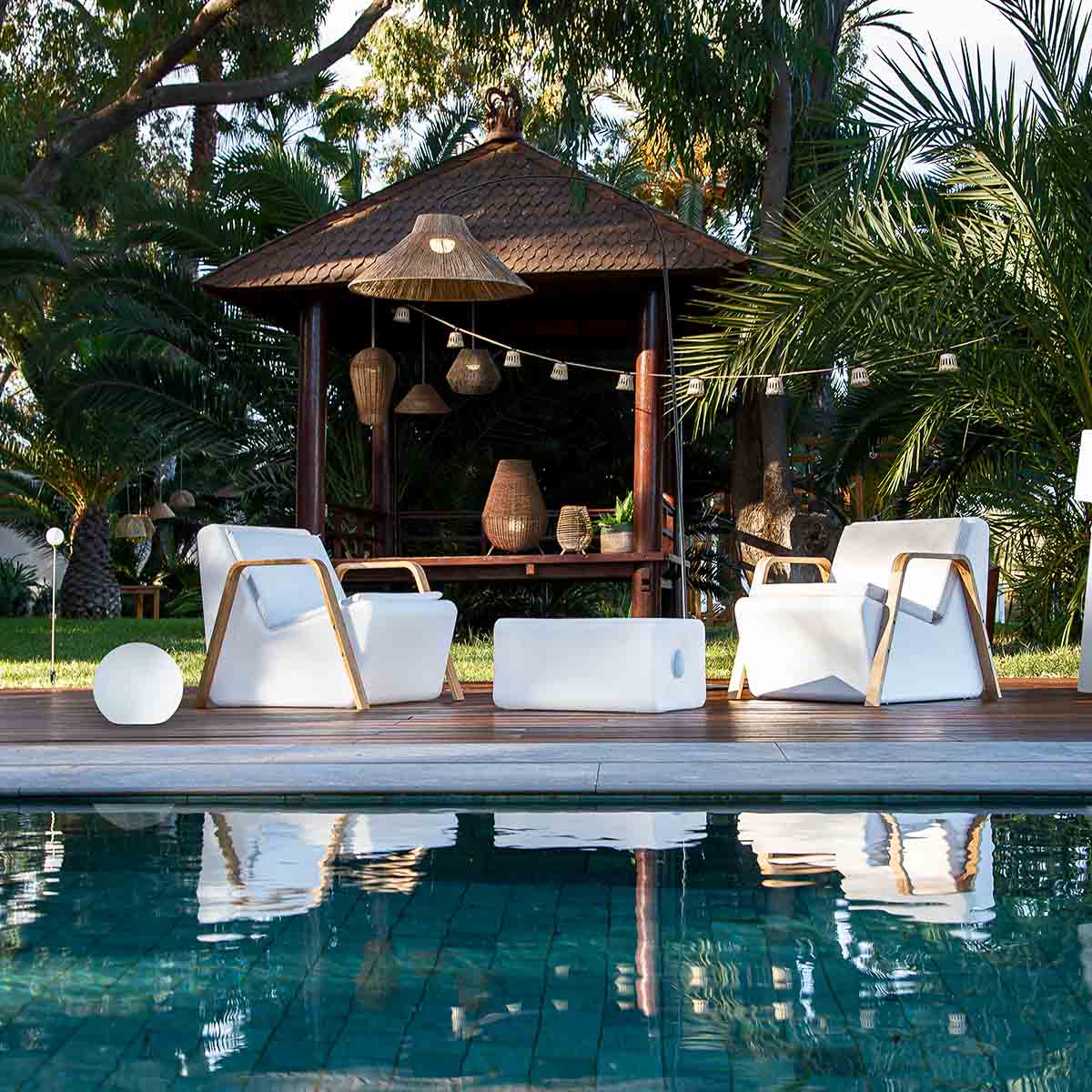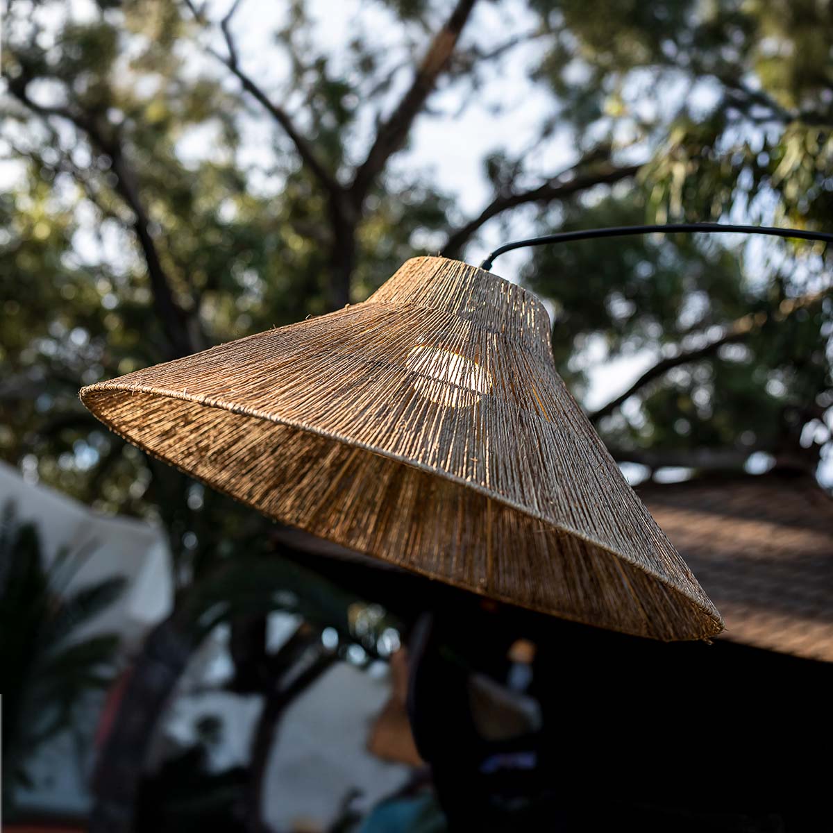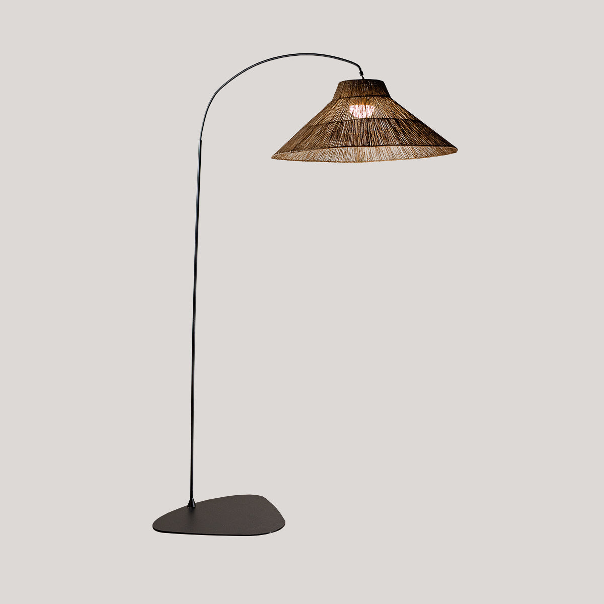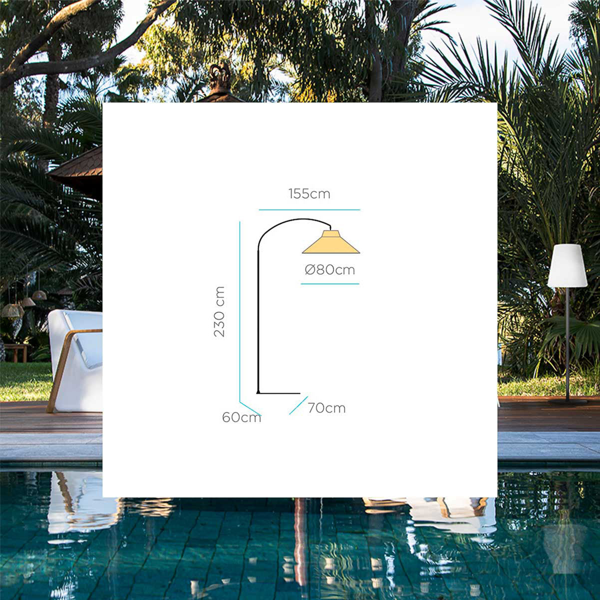 Niza è una lampada da terra che non ha bisogno di cavi. Il suo corpo in metallo laccato nero raggiunge un'altezza massima di 230 cm rendendola la lampada da terra ad arco ideale per qualsiasi spazio in giardino. Il suo paralume è intrecciato a mano con fibre naturali e ha un diametro di 80 cm.