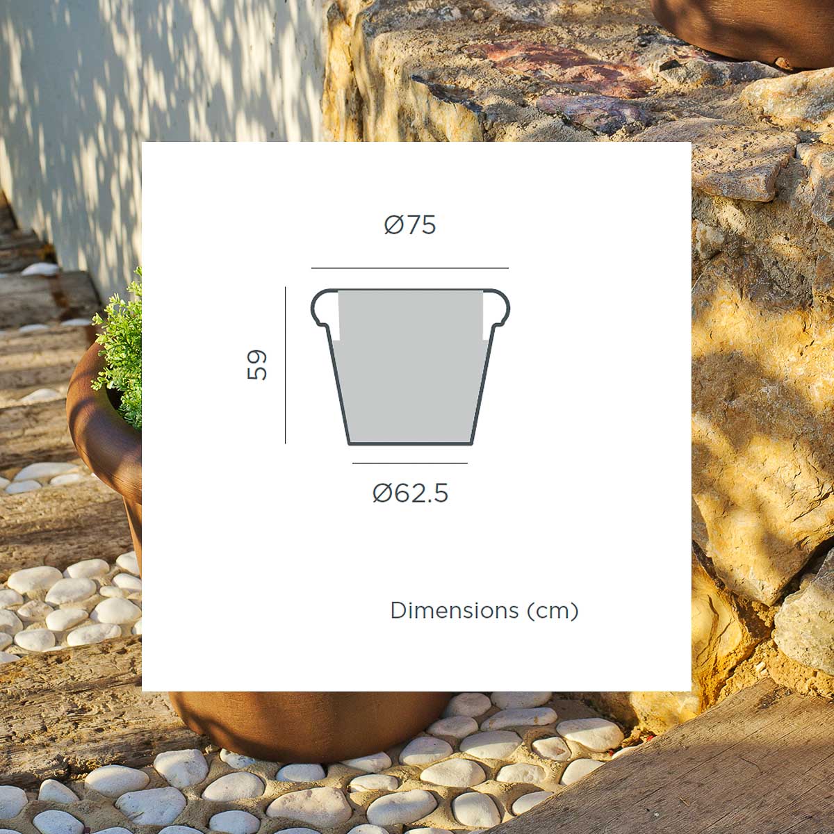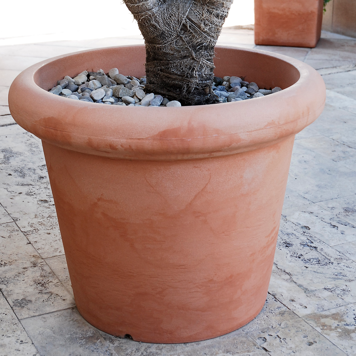 * ROSA 75 (ø75 x 59 cm) È una fioriera coniforme con un'ampia base per le piante. Le linee arrotondate e la texture della finitura rustica si ispirano al design delle fioriere classiche. Disponibile in varie dimensioni e colori.